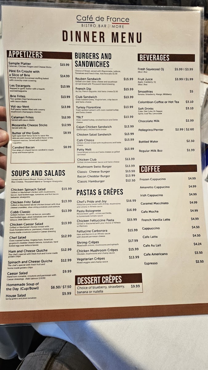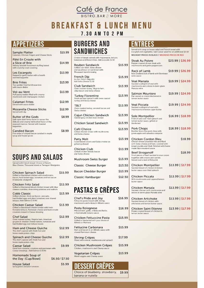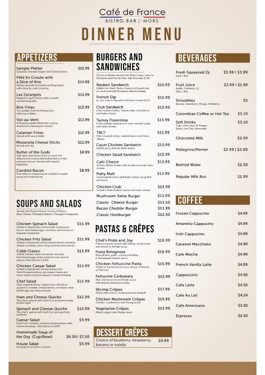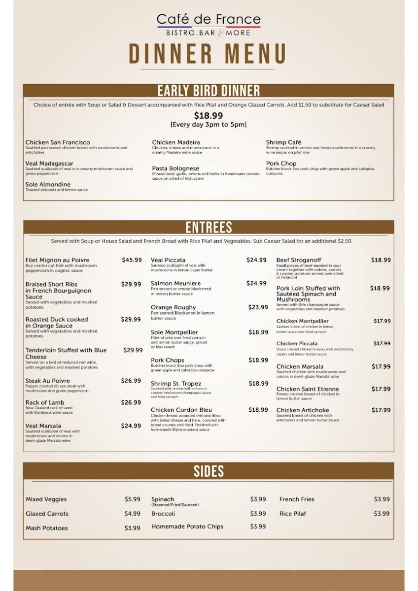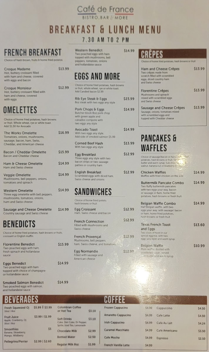 Welcome to Cafe de France, a charming dining spot nestled in the heart of Dallas, TX. This café captures the essence of French cuisine with a menu that delights the senses. Guests rave about the delectable offerings, particularly the Florentine Crepes, celebrated for their exquisite texture and flavor. The chicken and waffles stand out as a must-try, praised for their freshness and juiciness.